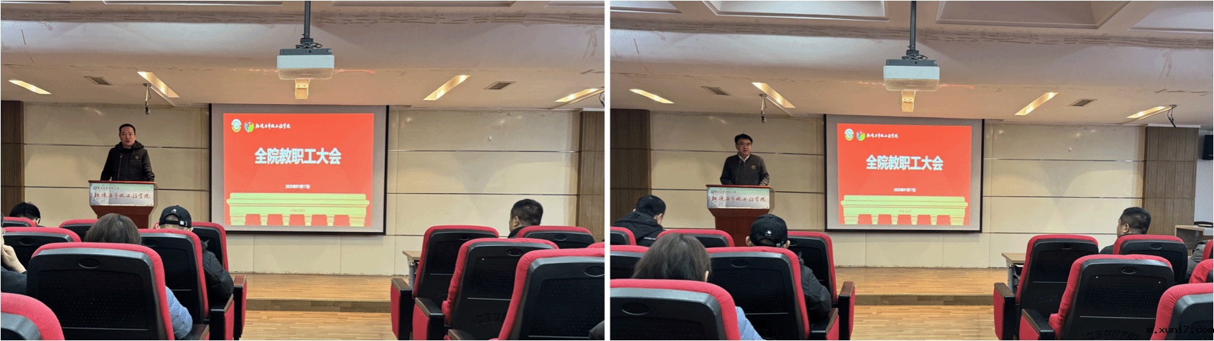 1月17日上午,环境学院在环工楼716报告厅召开全院教职工大会,学院党委书记曹宏伟主持会议并讲话,院长卢金锁总结学院2024年工作并对2025年寒假重点工作进行安排部署,学院全体教职工参加会议。