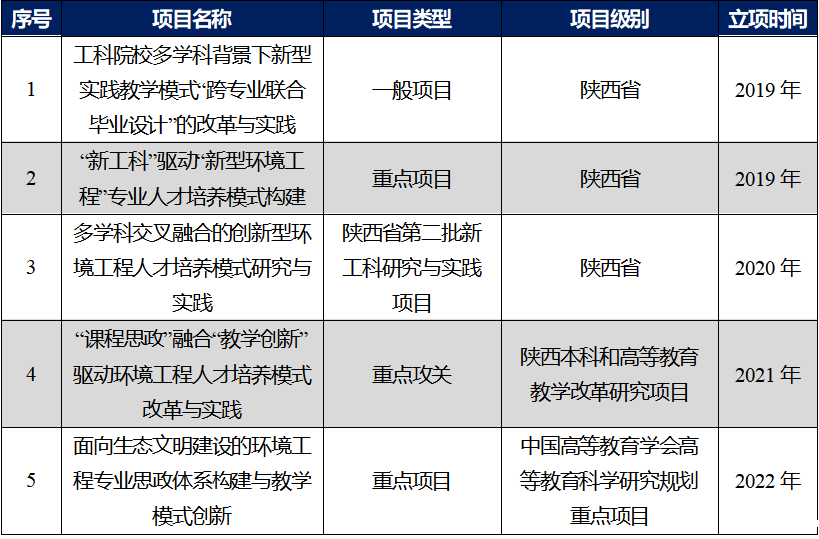 专业持续开展课程建设。“大气污染控制工程”与“环境工程微生物学”分别于2022年和2019年上线中国大学生MOOC平台。建设了“大气污染控制工程”、“环境规划与管理”、“环境影响评价”、“水污染控制工程”等陕西省精品资源共享课程。2021年,“水污染控制工程”课程获评陕西省首批课程思政示范课。此外,建成“环境工程微生物学”陕西省精品在线开放课程与陕西省线上一流课程,该课程于2022年推荐参评陕西省特色线上课程与陕西省课程思政示范课程。