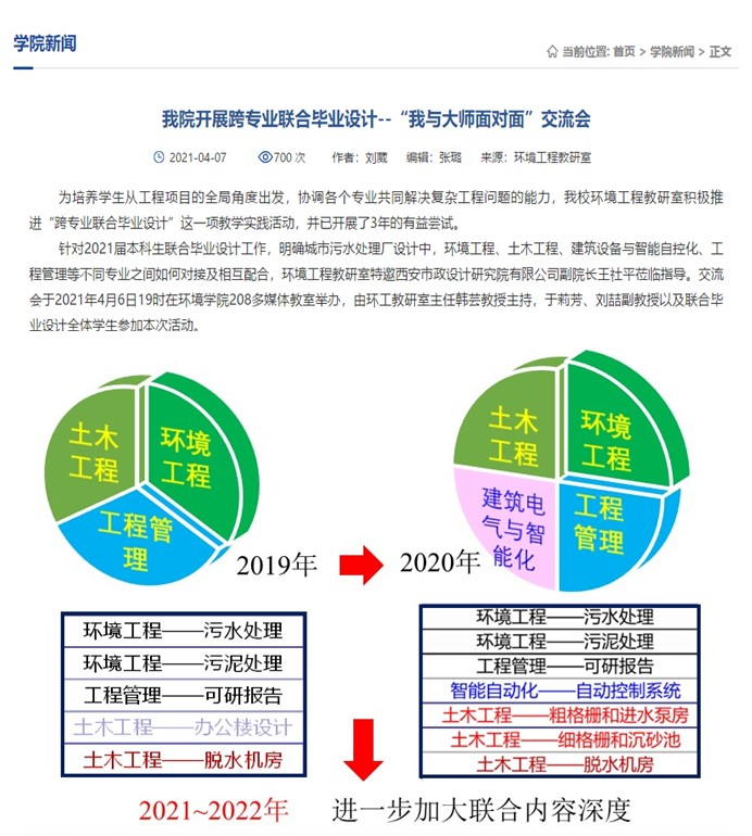 为充分发挥西北各高校环境类专业特色优势,由本专业牵头,联合西北大学、兰州理工大学、宁夏大学及内蒙古大学等环境类专业承担省级虚拟教研室建设项目:西北环境工程虚拟教研室。虚拟教研室目前已开展了青年教师课程设计指导能力培训工作坊(2021)、跨校联合毕业设计(2022)、西北环境工程虚拟教研室教学观摩与研讨(2022)等活动,实现优质教学资源库的共建共享,展现了我校环境工程专业的影响力,为提升西北地区环境工程专业建设发展做出贡献。依托“西北环境工程虚拟教研室”平台建设,跨专业联合毕业设计于2023年持续进化,在全国环境类专业范围内首次实现了跨校跨区域联合毕业设计工作的开展,展现出了显著的影响力和认可度。