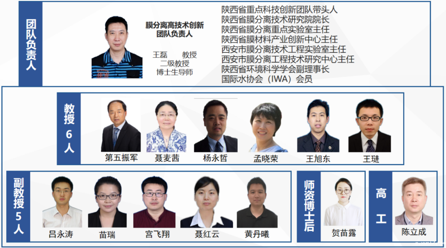 团队负责人:王磊,二级教授,博士生导师。陕西省膜分离技术研究院院长、陕西省膜分离重点实验室主任、陕西省膜分离重点科技创新团队带头人,陕西省膜材料产业创新中心主任,西安市膜分离技术工程实验室主任,西安市膜分离工程技术研究中心主任。教育部创新团队骨干成员,全国环境工程领域工程专业学位研究生教育协作组副组长,中国膜工业协会医药生物膜技术专业委员会委员,中国膜工业协会工程与应用专业委员会委员,日本土木学会会员,国际水协会(IWA)会员,陕西省环境科学学会副理事长,《水处理技术》,《膜科学与技术》等学术期刊编委等,Environmental Science & Technology和Water Research等期刊的审稿专家。获陕西省中青年科技领军人才、苏州高新区创新团队领军人才、中国侨界创新人才、陕西省优秀留学回国人员、西安市十大杰出青年、西安市十大杰出创业人物等人才奖及国际Eni奖提名、霍英东教育基金会全国高等院校优秀青年教师奖、宝钢教育基金等教育奖,第五届“互联网+”大学生创新创业大赛优秀创新创业导师等奖项。指导博士毕业13人,硕士毕业139人。