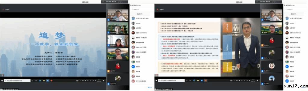 2022年1月8日晚,创业经验交流线上沙龙如期召开,这是系列线上的第一个沙龙活动。特邀嘉宾章武首先生是我校优秀校友,陕西省青年创业导师、陕西新泓水艺环境科技有限公司总经理、湖北建科国际工程有限公司陕西分公司总经理,教授级高级工程师,他演讲的主题是“追梦—从就学、就业到创业”。