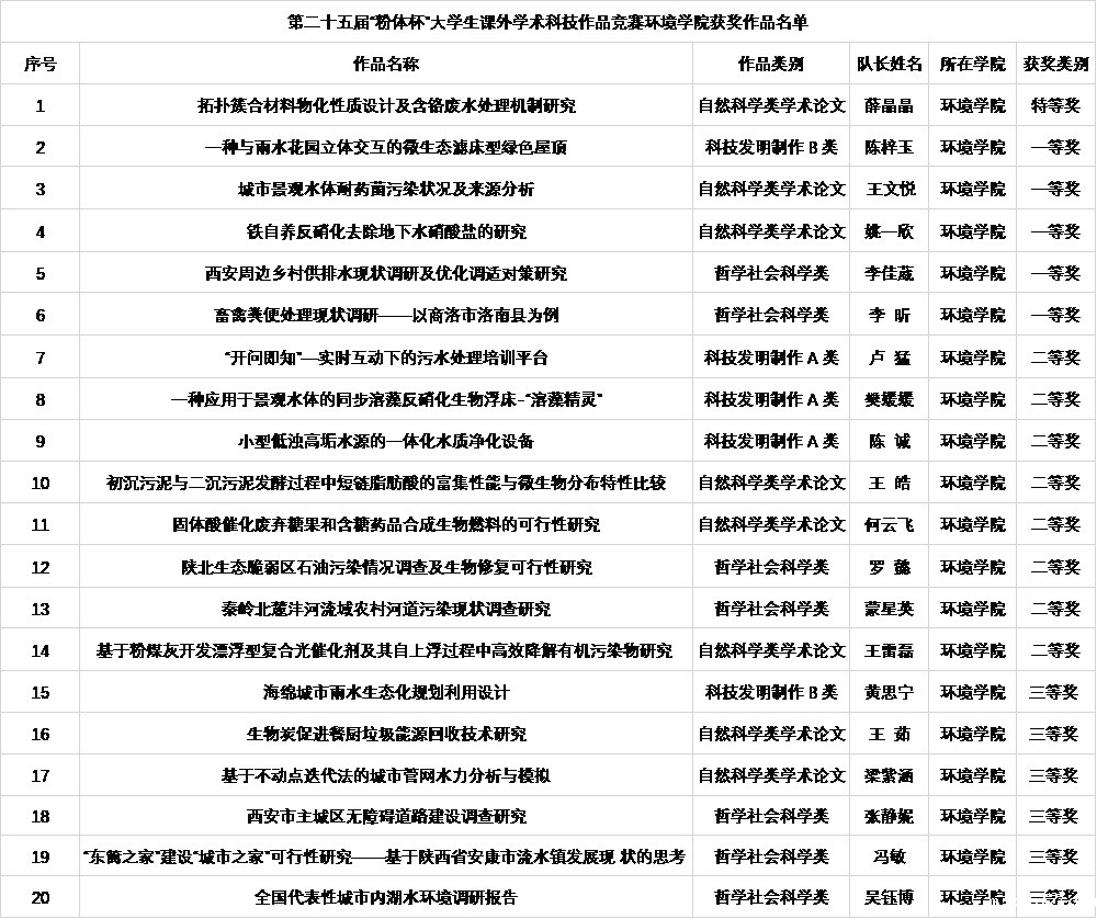 为积极响应“大众创新、万众创业”的号召,引导我校学生努力培养科学精神和科学态度,积极学习科学知识和科学方法,不断增强创新意识和创造能力,由双创办、校团委联合主办的第二十五届“粉体杯”大学生课外学术科技作品竞赛现已圆满结束。本届竞赛得到了广大师生的积极响应,共收到来自 17 个学院的542 件参赛作品,参赛学生达 2600 余人次,整个比赛涌现出了一批勇攀科研高峰、锐意创新创造的先进典型。环境学院在此次竞赛中取得特等奖一名,一等奖五名,二等奖八名,三等级六名的优异成绩,并且荣获“粉体杯”获奖单位。