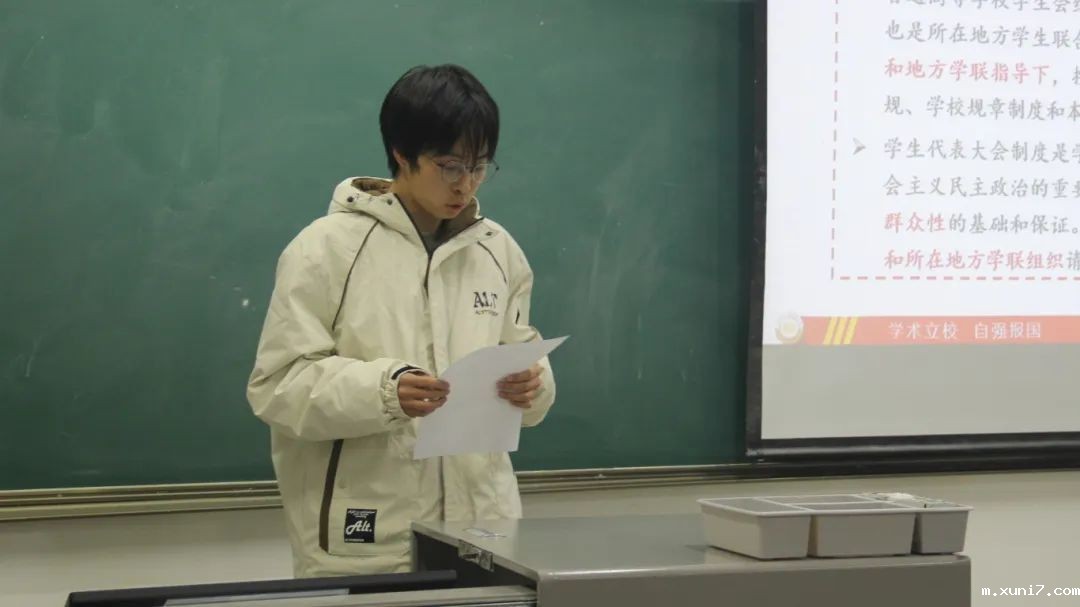 此外,环境学院学生会生活权益部主要负责人王嘉号同学讲述了《普通高等学校学生(研究生)代表大会工作规定》。他详细解析了大会的筹备流程、代表选举办法及议案处理方式等内容,并指出学生代表大会作为体现学生主体地位的重要平台,对于维护学生合法权益、促进学校发展具有不可替代的作用。