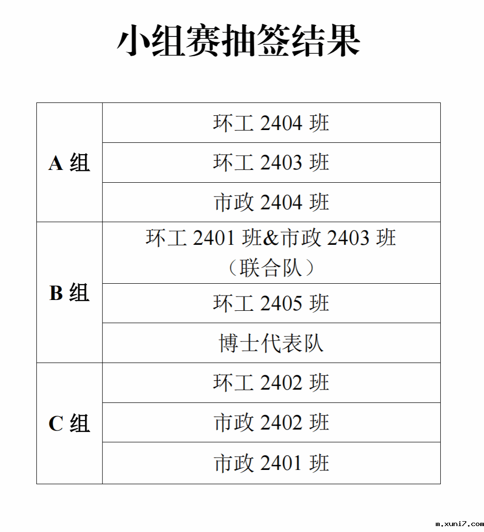 篮球赛以班级为单位参加,各个班级组成球队,部分班级与其他班级联合组成球队,共计9支球队(含1支博士生球队)。小组赛阶段,采取抽签方式将9支球队分为A(3支队伍)、B(3支队伍)、C(3支队伍)三个小组,采用循环制,即胜一场得3分,负一场得0分,弃权为0分,积分多者名次列前。A组(3支队伍)积分前两名晋级淘汰赛,B组(3支队伍)积分前两名晋级淘汰赛,C组(3支队伍)积分前两名晋级淘汰赛,共计六支队伍晋级淘汰赛。若同分则以下列方式依次排名: