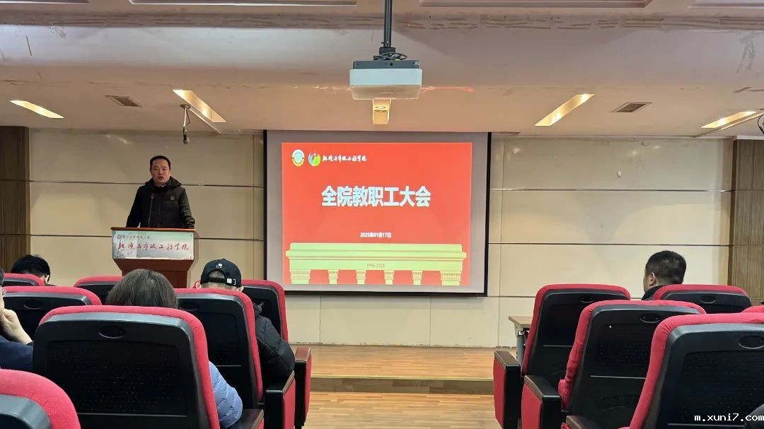 1月17日上午,环境学院在环工楼716报告厅召开全院教职工大会,学院党委书记曹宏伟主持会议并讲话,院长卢金锁总结学院2024年工作并对2025年寒假重点工作进行安排部署,学院全体教职工参加会议。