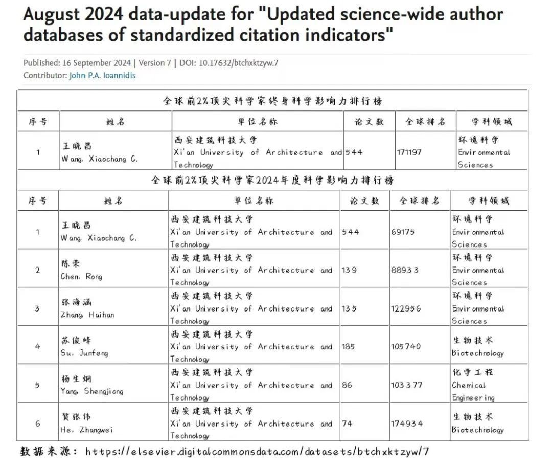 近日,美国斯坦福大学发布了2024年版全球前2%顶尖科学家榜单,我院有多位教师入围。其中,王晓昌教授入选“终身科学影响力排行榜”和“2024年度科学影响力排行榜”,陈荣、张海涵、苏俊峰、杨生炯、贺张伟等5位教师入选“2024年度科学影响力排行榜”。