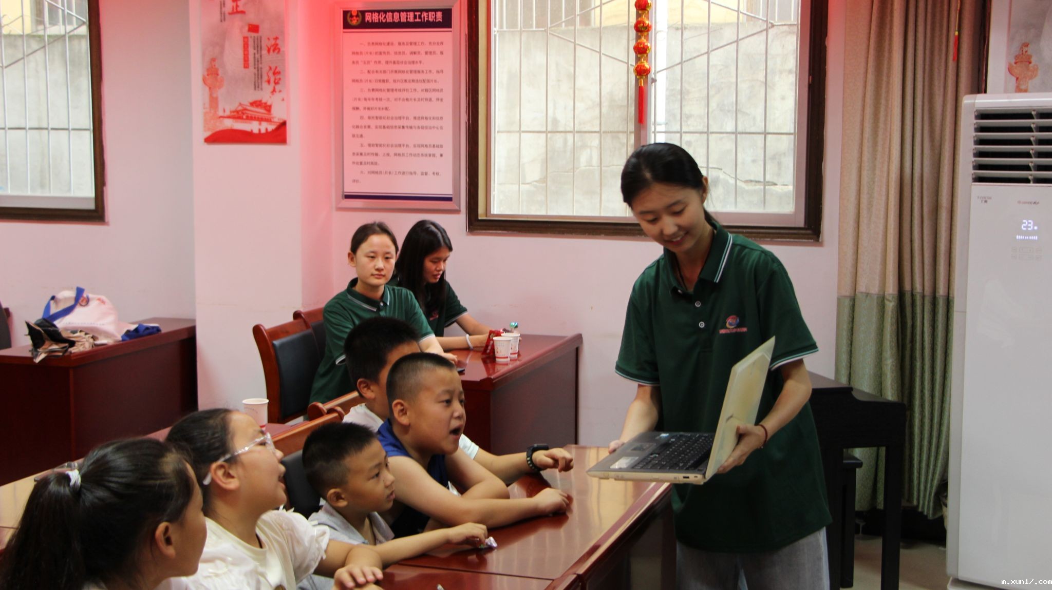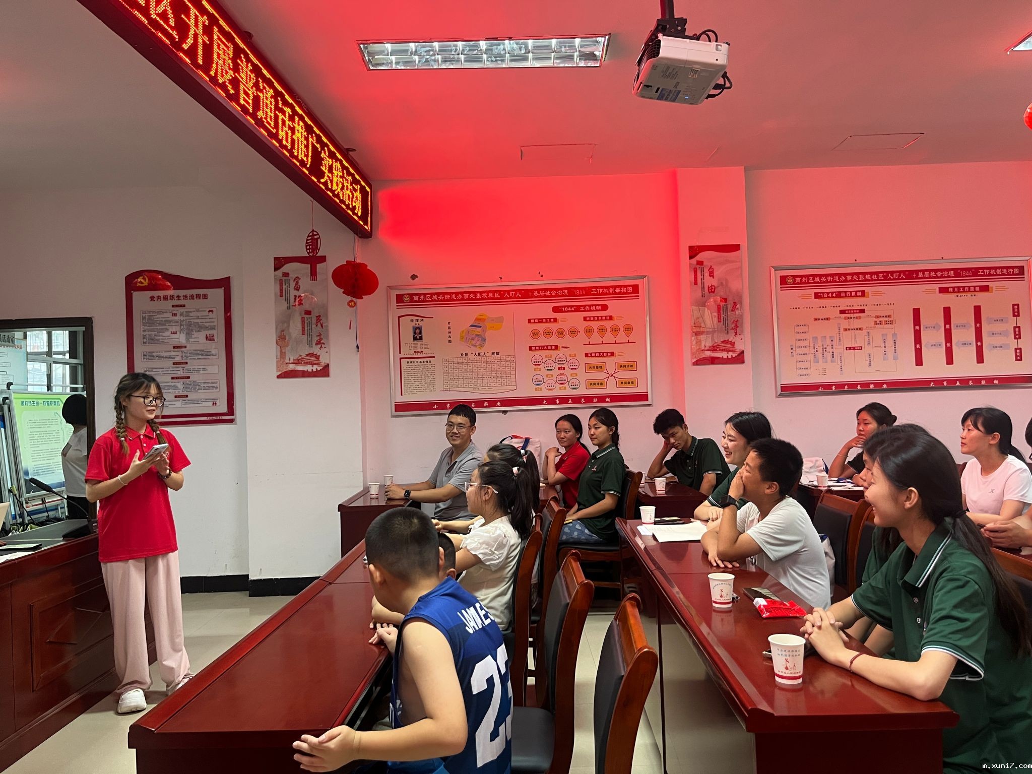 图为团队成员陈昱如同学在张坡社区文明站带领小朋友们朗诵课文《白杨礼赞》。通讯员李泽楷摄