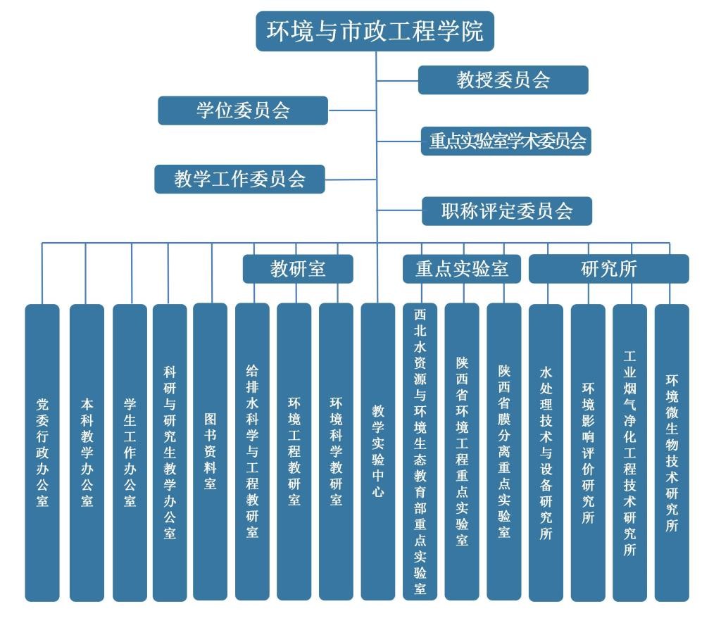 环境与市政工程学院组织机构由学术机构、行政办公与教学科研管理机构、教研室、实验室、教学实验中心和研究所(研究基地)组成。其中:学术机构包括:教授委员会、学位委员会、职称评定委员会、学术委员会、教学委员会、重点实验室学术委员会、教学督导组。行政办公与教学科研管理机构包括:党委/行政办公室、教学办公室、研究生/科研办公室、学生工作办公室、图书资料室。教研室包括:环境工程教研室、给排水科学与工程教研室、环境科学教研室和热工流力教研室。实验室包括:西北水资源与环境生态教育部重点实验室、陕西省环境工程重点实验室和国家级环境类专业教学实验中心。研究所(研究基地)包括:陕西省污水处理与资源化工程技术研究所、环境工程研究所、水处理技术与设备研究所、环境影响评价研究所、工业烟气净化工程技术研究所、国家城市非传统水资源开发利用国际科技合作基地和陕西省西部建筑科技重点实验/室省部共建国家重点实验室培育基地。如下图所示: